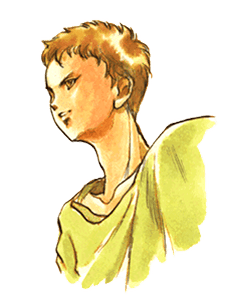 His blond hair is light like his mother's. He wears a loose, green shirt along with black pants and brown boots with green trim. | His blond hair is light like his mother's. He wears a loose, green shirt along with black pants and brown boots with green trim. | ||