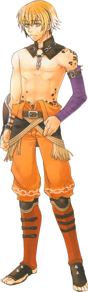 Ernst was a young boy who came across the Beast Rune in some ruins and was transformed into a leopard by its curse. Accompanied by his childhood friend, Norma, they sought a powerful magician to remove his curse, eventually arriving in the Queendom of Falena. He would help he and Norma earn potch by performing tricks, using his human intelligence to impress onlookers.
