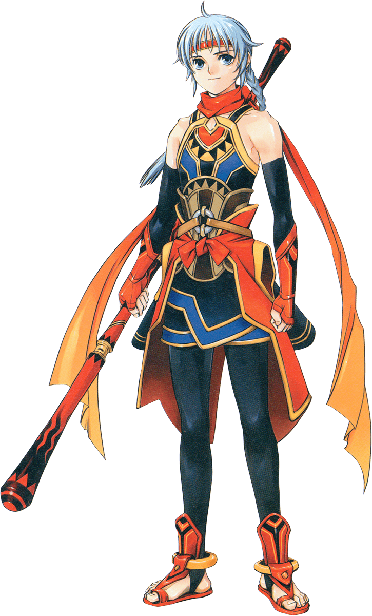 The outfit he wears the most in Suikoden V, however, is a special battle outfit made for him. In order to manipulate the special three-part staff, ease of movement was the primary consideration for this outfit.