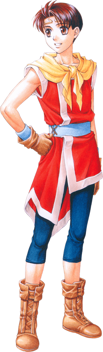 He lives in Kyaro Town, a small town in the Highland Kingdom. Brought up together with Nanami under the tutelage of Genkaku, who ran a dojo there, the hero is caught up in the tides of destiny and finds himself immersed in battle. As time passes, he grows and matures, seeing a farewell to his home, a battle with his best friend Jowy, as well as the loss of loved ones.