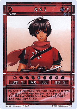 |summary=[[Kasumi]] card number [[Kasumi ( | |summary=[[Kasumi]] card number [[Kasumi (CS card 196)|196]] from the [[Genso Suikoden Card Stories TCG]], released December 20, 2001. | ||