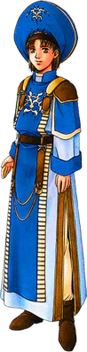 In Genso Suikogaiden Vol.2, his hat is smaller, and he also has a short, dark blue cape draped about his shoulders. In Suikoden III, he does not wear a hat, and his robes have been replaced with a blue shirt with white trim with the Harmonian insignia on the front and white pants.