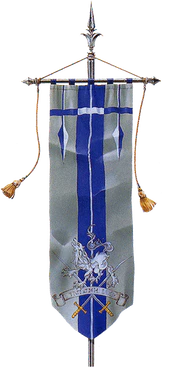 The flag of the Highland Kingdom is white, with blue tones. The Beast Rune, which was bestowed by Hikusaak along with the title of King, is also a recurring motif, represented by the white wolf as a symbol of masculinity and nobility. (more...)
