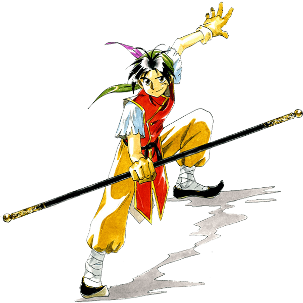 Originally the hero was designed to wield a sword and some pieces of art depict him wielding one. However, a decision was made to give the hero a more Chinese and/or continental Asian flavor and so the staff was chosen for him instead. He was originally conceptualized as the son of a bandit, which was the initial reason for his slightly torn clothing.