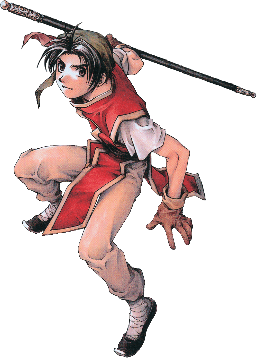 With the support of Gremio and Teo's other subordinates, such as Cleo and Pahn, he grew into a vigorous young man with a strong sense of justice. Master Kai, meanwhile, trained him in the use of the staff as a youth. Once Kai left, his abilities became entirely self-taught.
