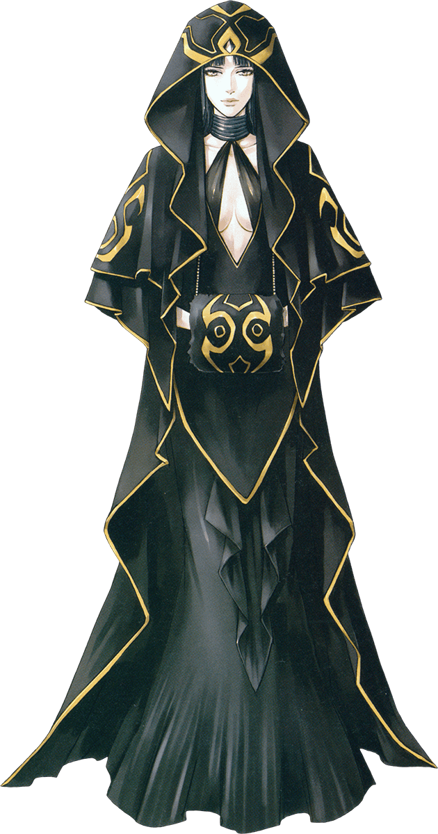 Zerase is a pale, slender woman clad exclusively in black with gold trim. According to designer concept art, Zerase's long black hair reaches to the small of her back where it is tied together in a low, loose ponytail. She has cool blue eyes, emphasised with purple eye shadow. Under her flowing, dark robes, she wears a sheer dress, held in place by her choker. On each wrist she wears five dark bangles.