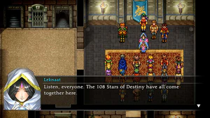 Leknaat, meanwhile, would describe the assembled 108 Stars of the Toran Liberation Army as stars that freely traveled across the skies. Previously, during the Sun Rune War, Leknaat had described the stars as "guides", noting that destiny did not shape people's lives. The Tenkai Star was a bright red star that she could observe appearing in the sky during times of strife, drawing other stars to it[1].