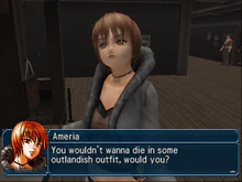 • Ameria is one of three characters in Suikoden Tactics who does not show any form of Good Will with other characters, the other two characters being Wendel and Lalacle.