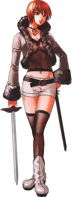 Ameria was a beautiful swordswoman who wandered the land, serving as a mercenary and bodyguard. She was very concerned about her personal appearance, rationalizing it as a reward for all the life-risking work she frequently undertook.