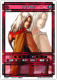 Axel (アクセル, Akuseru) is a Leader-class character card from the Genso Suikoden Card Stories TCG. It is part of the CS2 Booster Pack Vol.4 expansion and is numbered CS2-647.