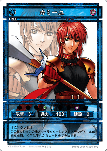 Camille (カミーユ, Kamīyu) is a Free-class character card from the Genso Suikoden Card Stories TCG. It is part of the Remake Booster expansion and is numbered CS2-565/R234.