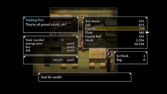 Candles (ロウソク, Rōsoku) are a trade item in several games of the Suikoden series.
