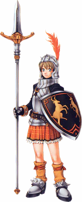 She is normally in her father's silver torso armor and helmet, with an orange plumage. The armor especially is oversized on her young frame, giving a somewhat comical appearance. She wears an orange and yellow plaid skirt with white fringe, long orange socks, and armored boots. She carries a large shield emblazoned with the Zexen crest as well as her spear.