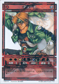 Duke (デューク, Deyukū) is a Leader-class character card from Genso Suikoden Card Stories Chapter II. It is part of the CS2 Booster Pack Vol.1 release and is the card numbered CS2-012.