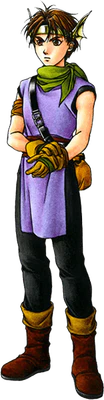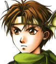 A handsome lad with brown hair and eyes, in his adolescence Futch was a medium sized boy who wielded a spear. In Suikoden, he wore a small breastplate over a tunic along with brown boots and gloves. He also wore a distinctive green scarf and winged headband. His spear was originally made to be the same height as himself when he was 11 years old.
