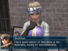 Gretchen (グレッチェン, Guretchen) is a supporting character in Suikoden IV and Suikoden Tactics. Gretchen is a talented swordswoman who spends most of her time immersed in her training regimen.