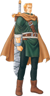 His Suikoden II outfit is more geared towards traveling. He wears a green tunic with long sleeves, secured at the waist with a brown belt. Over this, he wears a large yellow cloak that drapes over his shoulders and extends down his back. He also wears black pants and brown boots. His broadsword is strapped to his back and is wrapped in cloth, rather than kept in a scabbard.