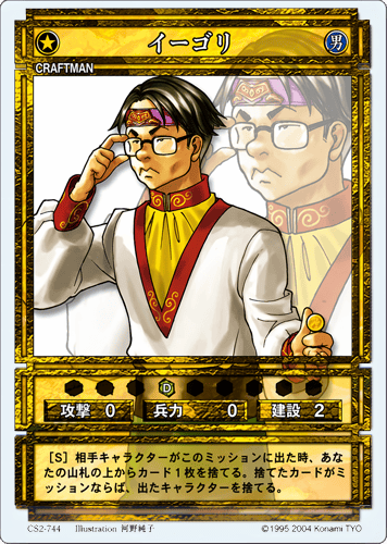 Igor (イーゴリ, Īgori) is a Craftman-class character card from Genso Suikoden Card Stories Chapter II. It is part of the CS2 Booster Pack Vol.4 release and is the card numbered CS2-744.