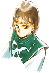 In Suikoden III, he wears a long, dark green coat over a brown shirt, along with black pants, brown boots and black gloves, to hide his True Wind Rune. His clothing is lighter and more practical for the traveling he was undertaking as part of the Destroyers.