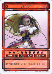 Lucia (ルシア, Rushia) is a Commoner-class character card from the Genso Suikoden Card Stories TCG. It is part of the Booster Pack Vol.1 expansion and is numbered 073.