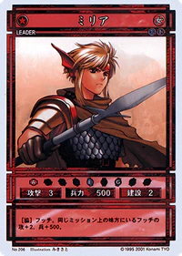 Milia (ミリア, Miria) is a Leader-class character card from the Genso Suikoden Card Stories TCG. It is part of the Booster Pack Vol.2 expansion and is numbered 206.
