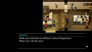 Millian's Armor Emporium was a popular armor store located in Muse City. It was run by Millian and Melia, who were reputed to be beautiful sisters, and the store and its goods and services were very well regarded.