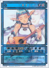 Nei (ネイ, Nei) is a Free-class character card from Genso Suikoden Card Stories Chapter II. It is part of the CS2 Starter Deck & Booster Pack Vol.1 release and is the card numbered CS2-085.