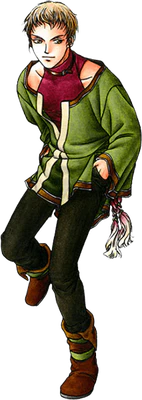 In Suikoden, he wears a low-hanging necklace and an earring on his left ear, while in Suikoden II he instead wears a loose choker around his neck and no earring. He also has a decorative tassel hanging from his tunic sleeve.