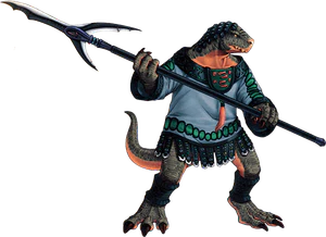 Shiba is a warrior from a southern Lizard Clan who helps to assist Dupa as the Left Fighter in Unit Two of the Lizard Clan's Three Bodies Fighters. He is a strong, prideful warrior, wielding a gride, a trident-like spear weapon traditionally used by the Lizard Clan, but is also rational and realistic. He is prepared to fight and die to protect the Lizard Clan.