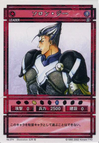 Solon Jhee (ソロン・ジー, Soron Jī) is a Leader-class character card from the Genso Suikoden Card Stories TCG. It was of the Premium Pack expansion and was numbered 274.