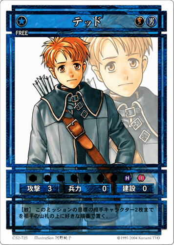 Ted (テッド, Teddo) is a Free-class character card from the Genso Suikoden Card Stories TCG. It is part of the CS2 Booster Pack Vol.4 expansion and is numbered CS2-725.