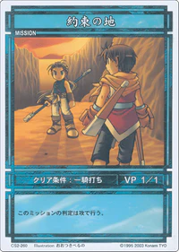 The Promised Land (約束の地, Yakusoku no Ji) is a Mission type card from Genso Suikoden Card Stories Chapter II. It is part of the CS2 Booster Pack Vol.2 expansion and is the card numbered CS2-260.