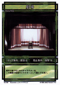 Theater (劇場, Gekijō) is a Facilities type Genso Suikoden Card Stories TCG card. It is part of the Booster Pack Vol.3 series and is numbered 469.