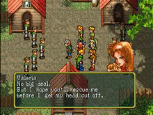 Valeria (バレリア, Bareria) is a supporting character in Suikoden and Suikoden II who also appears in Genso Suikogaiden Vol.2. Valeria attempted to stop Kwanda Rosman's scheme to annihilate the Great Forest.