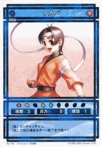 Wakaba (ワカバ, Wakaba) is a Free-class character card from the Genso Suikoden Card Stories TCG. It is part of the Booster Pack Vol.1 expansion and is numbered 148.