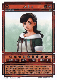 Yumi (ユミィ, Yumyi) is a Commoner-class character card from the Genso Suikoden Card Stories TCG. It is part of the Booster Pack Vol.4 expansion and is numbered 506.